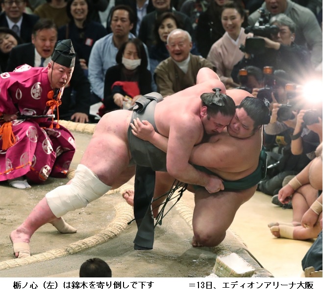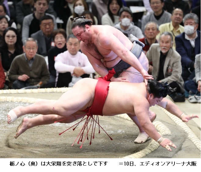 ▼角番の大関 栃ノ心に大栄翔は、栃ノ心が突き落とし。