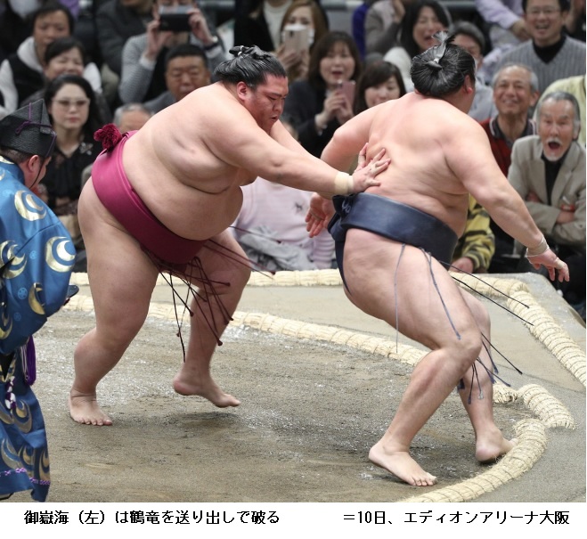鶴竜を破った御嶽海は「よかった。相手が引いてくれたので、ついていくだけだった。立ち合いで遅れて押し込まれたが、姿勢を低くしてついていった。立ち合いでもっと下から当たらないとね。修正するところはたくさんある」と話していました。