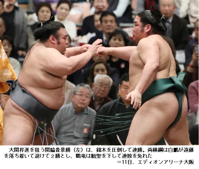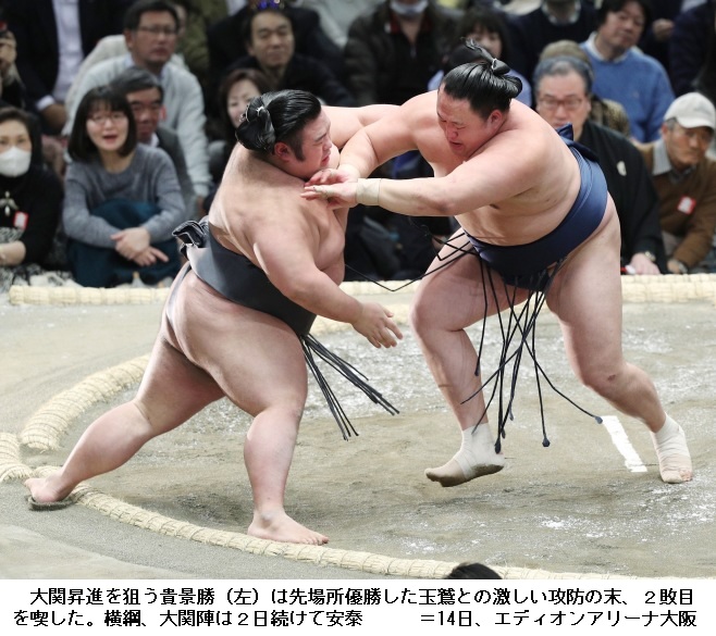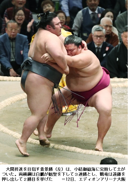 大相撲春場所5日目 大関昇進のかかる貴景勝が2敗目 ―― 平成最後の大相撲春場所は5日目、大関昇進のかかる貴景勝は、玉鷲との関脇どうしの一番に押し出しで敗れました。貴景勝は、序盤の5日間を3勝2敗で終え、中盤戦に入ります。