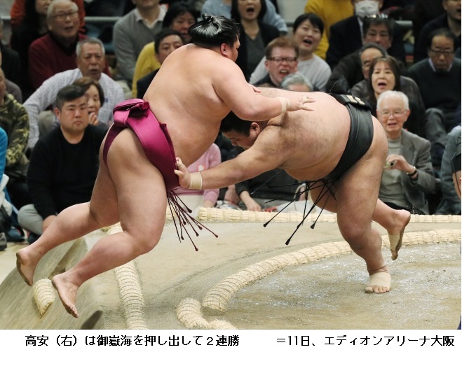 ▼小結 御嶽海に大関 高安は、高安が押し出し。高安は2分近い相撲を制しました。