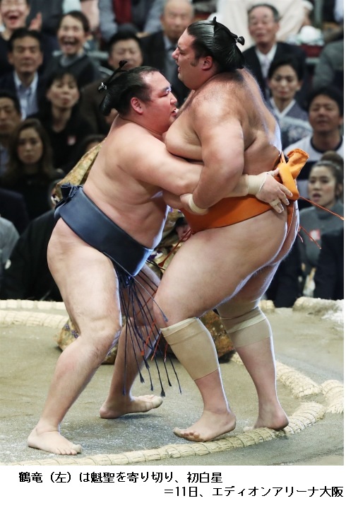 ▼ 横綱 鶴竜に魁聖は、鶴竜が寄り切り。10日の初日に敗れた鶴竜は、今場所初白星です。 (NHK WEB NEWS 2019年3月11日 18時56分)