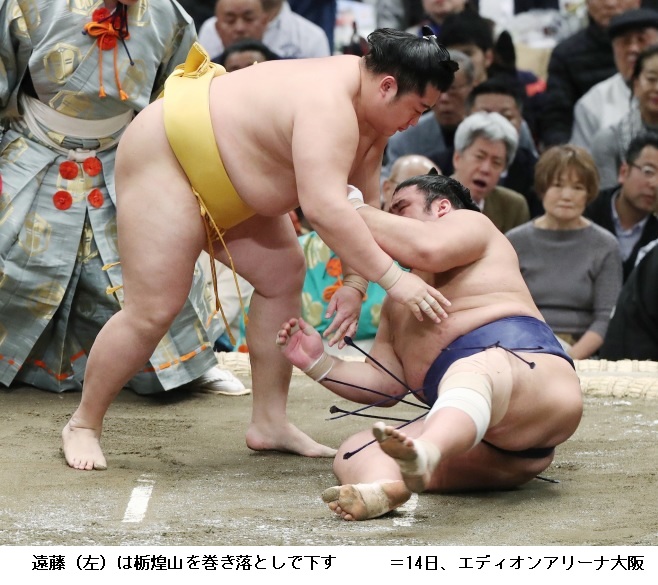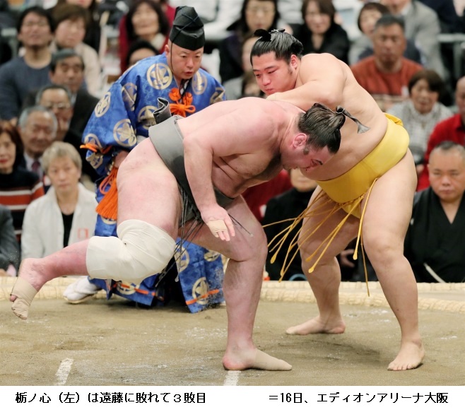 ▼大関 栃ノ心に遠藤は、遠藤が寄り倒しで勝ちました。角番の栃ノ心は3敗目です。