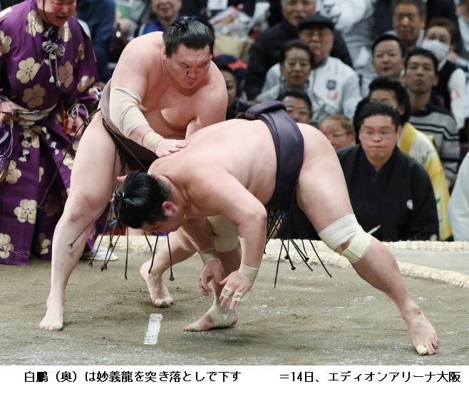 ▼横綱 白鵬に新小結 北勝富士は、白鵬が突き落としで勝ちました。