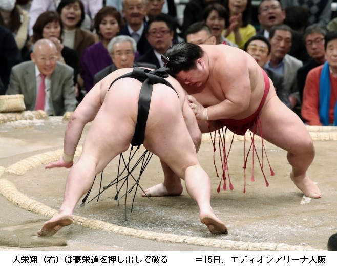▼大関 豪栄道に大栄翔は、大栄翔が押し出しで勝ちました。豪栄道は今場所初黒星です。