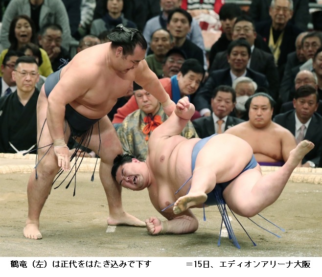 ▼横綱 鶴竜に正代は、鶴竜がはたき込みで勝ちました。