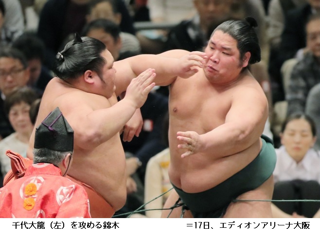 ▼千代大龍に錦木は、錦木が押し出しで勝って今場所、初白星です。