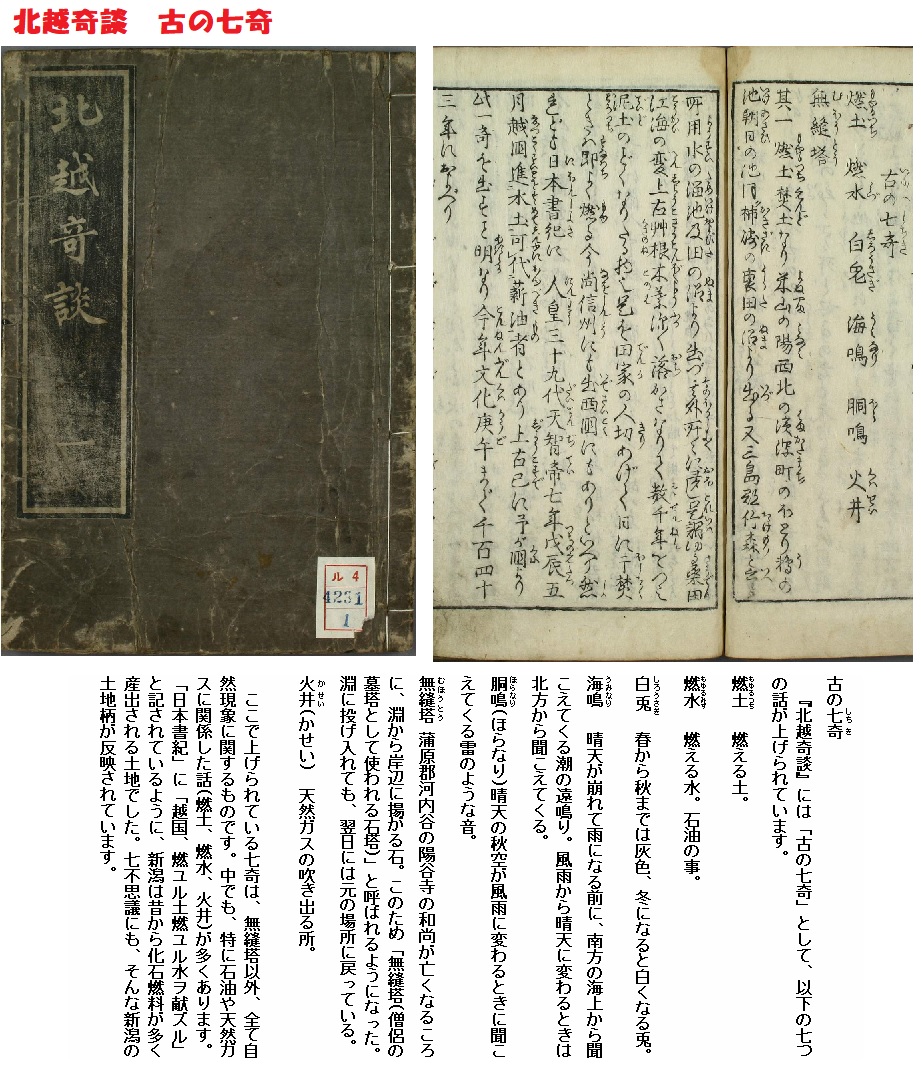 ある特定の地域において不思議な現象として取り上げられる7種の事柄です。一般に地名が冠せられて「何々の七不思議」と称されます。広く知れ渡っているものに越後(えちご)(新潟県)の七不思議があります。『北越奇談』によると、「燃ゆる土、燃ゆる水、白兎(はくと)、海鳴り、胴(ほら)鳴り、火井(かせい)、無縫塔」があげられています。このうち燃ゆる土、燃ゆる水、火井は、それぞれ石炭、石油、天然ガスのことであり、海鳴り、胴鳴りとは天気の変わり目に遠くから聞こえてくる海潮音、怪奇な轟音(ごうおん)のことである。白兎は冬季に真白な体毛をもつ越後の兎(うさぎ)のことで、無縫塔とは奇岩の呼称である。これらはいずれも自然現象に関することであるが、科学的な説明の十分ではない当時において、これを怪異な現象とみなし七不思議と名づけて喧伝(けんでん)したものなのでしょう。