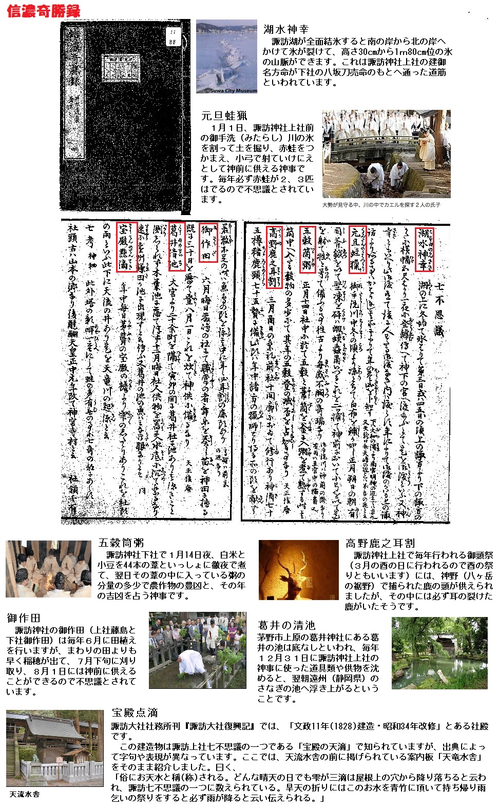 信濃(しなの)(長野県)の諏訪(すわ)の七不思議も古くから伝えられているものです。『信濃奇勝録』によれば、「湖水神幸(こすいみわたり)、元旦蛙猟(がんたんのかえるがり)、五穀筒粥(ごこくつつがゆ)、高野鹿(こうやしか)の耳割(みみわれ)、御作田(みさくだ)、葛井清池(くずいのせいち)、宝殿点滴(ほうでんてんてき)」があります。これらは諏訪神社の祭祀(さいし)行事と深く関連するものです。人々の素朴な信仰心が、このような特異な神事に対して七不思議と称し崇(あが)めたのであろう。同様のことは仏教に関してもいえます。