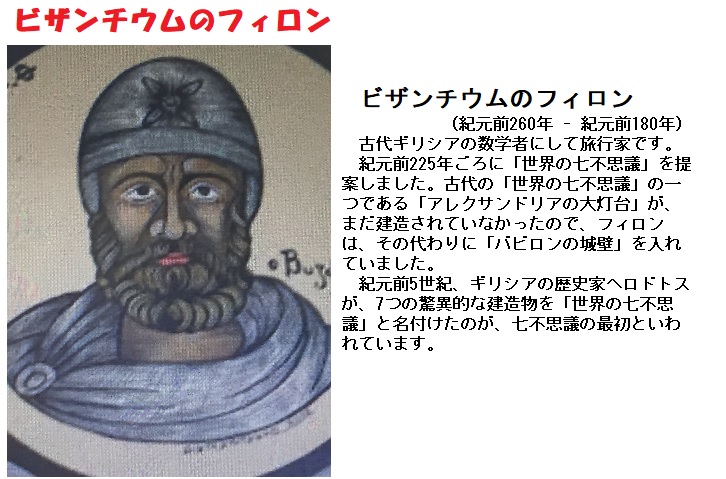 フィロンの七不思議で現在も残っているのはギザのピラミッドだけですが、この時破壊されなければもっと空中庭園の名残は残っていたかもしれません。