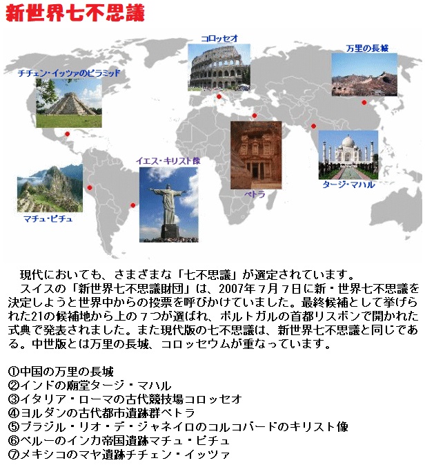 この他、シドンのアンティパトロス(紀元前2世紀後半の古代ギリシャの 詩人)、ローマの大プリニウス(ピラミッドやスフィンクス、アレクサンドリアの大灯台、エフェソスのアルテミス神殿、エジプト・クレタ島・リムノス島などの迷宮、キュジコスの神殿や競技場、テーベ、パクス神殿や競技場・劇場・水道橋などのローマの建築物)など、さまざまな学者・歴史家・詩人が七不思議を選定しています。