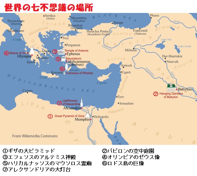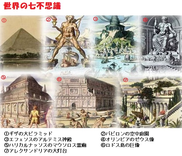 世界の七不思議とは、諸説あり、数多くの学者などがそれぞれに選定していますが、一般的にはフィロンが書いた「世界の七つの景観」の中で選ばれた、下記の7つの巨大建造物のことを指し、最近選定された「新世界の七不思議」と区別して「古代世界の七不思議」とも呼ばれます。