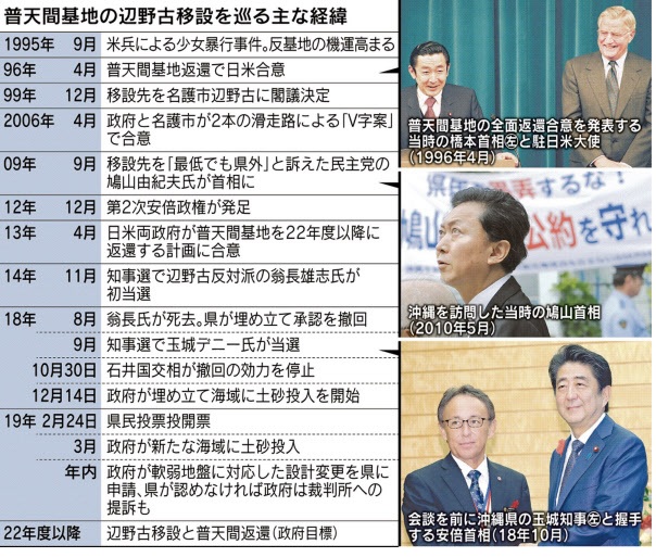 辺野古移設、解けぬ対立 22年度返還一段と困難に ―― 米軍普天間基地(沖縄県宜野湾市)の名護市辺野古への移設を巡る沖縄県民投票は反対票が7割を超えた。2018年9月の知事選で移設反対を掲げた玉城デニー知事が当選したのに続き、辺野古移設に論点を絞っても反対の民意が示された。政府は移設工事を進める構えだが県との対立が解消する見込みはなく、日米両政府が合意した最短で22年度の返還目標の達成は一段と厳しくなった。
