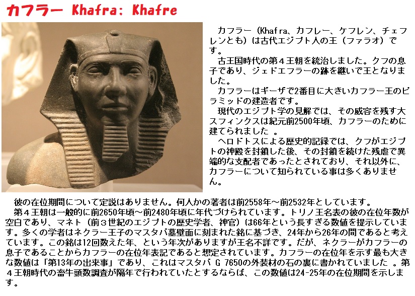 カフラー王はエジプト古王国の第4王朝ファラオで、クフ王の息子です。クフ王の後を継いだのがジェドエフラー王ですが、その統治は短く、後を異母兄弟であるカフラーが継ぎました。その墳墓として、このピラミッドが建てられたのです。