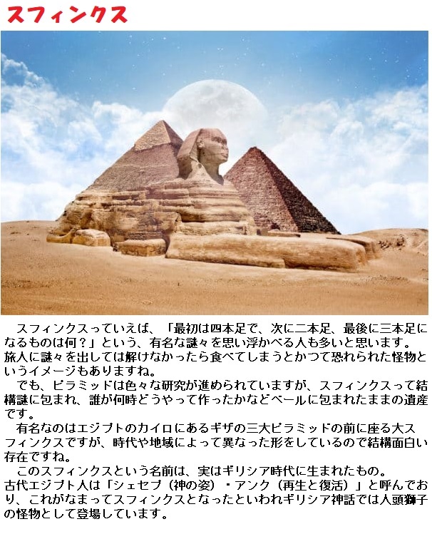 スフィンクスの元々の名前は「シェプスアンク」といいます。これがなまってスフィンクスになりました。「シェプス」は姿という意味を持ち、「アンク」は復活や再生の神様という意味です。スフィンクスは太陽神を表わしていたのです。