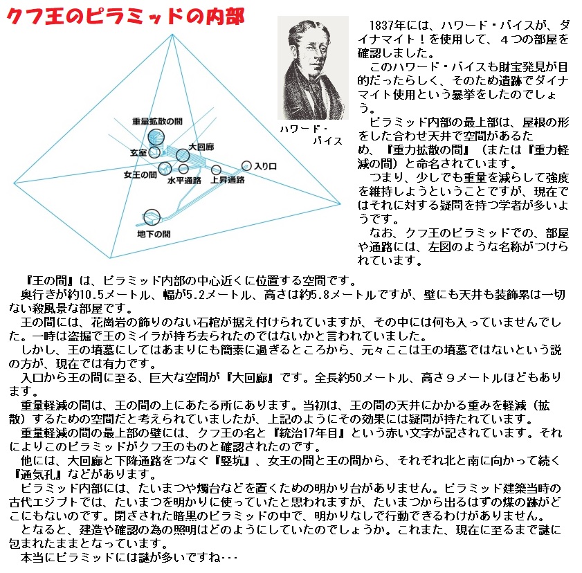 クフ王のピラミッドは、1839年にイギリス軍人のハワード・ヴァイスによって発見されました。彼は、ピラミッド内部にあり、王の間にかかる重量を軽減するために造られたとする「重量軽減の間」にクフ王の名前を見つけ、ここがクフ王のピラミッドであると結論づけたのです。