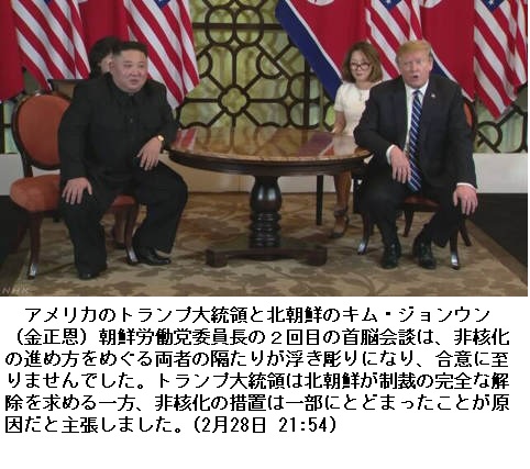 米朝首脳会談 非核化の進め方で合意に至らず ―― アメリカのトランプ大統領と北朝鮮のキム・ジョンウン(金正恩)朝鮮労働党委員長の2回目の首脳会談は、非核化の進め方をめぐる両者の隔たりが浮き彫りになり、合意に至りませんでした。トランプ大統領は北朝鮮が制裁の完全な解除を求める一方、非核化の措置は一部にとどまったことが原因だと主張しました。