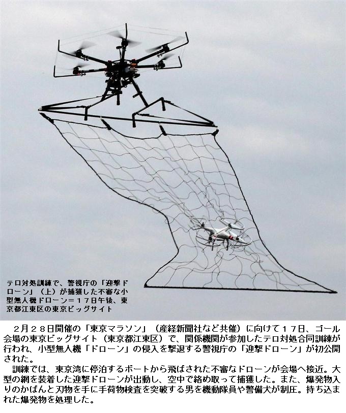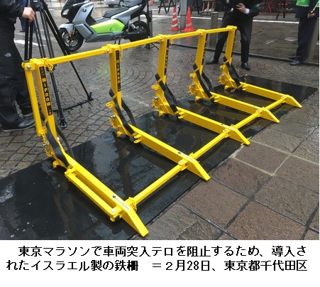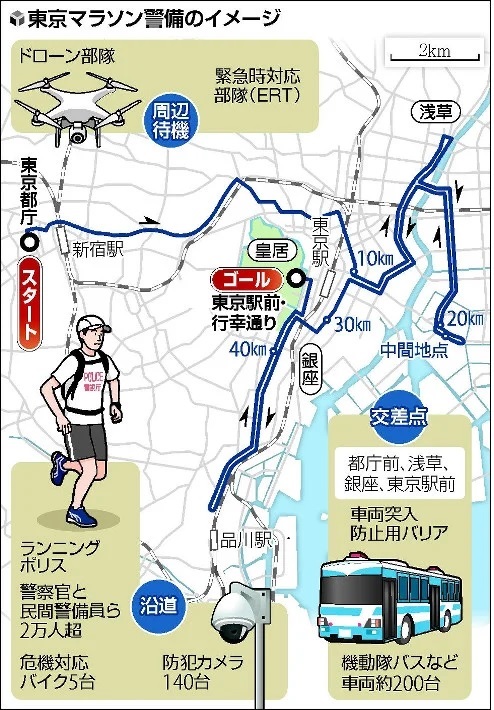 東京マラソンでは、機動隊バスなど計約200台で防護壁を築くほか、スタート地点の都庁前(新宿区)や浅草(台東区)、銀座(中央区)、東京駅前周辺(千代田区)には、イスラエル製の鉄柵(高さ70センチ、重さ22キロ)を組み合わせた「車両突入防止用バリア」を設置。コースに通じる路地も鉄柵や車止めで封鎖する。上空は、訓練を受けた「ドローン部隊」が警戒にあたる。