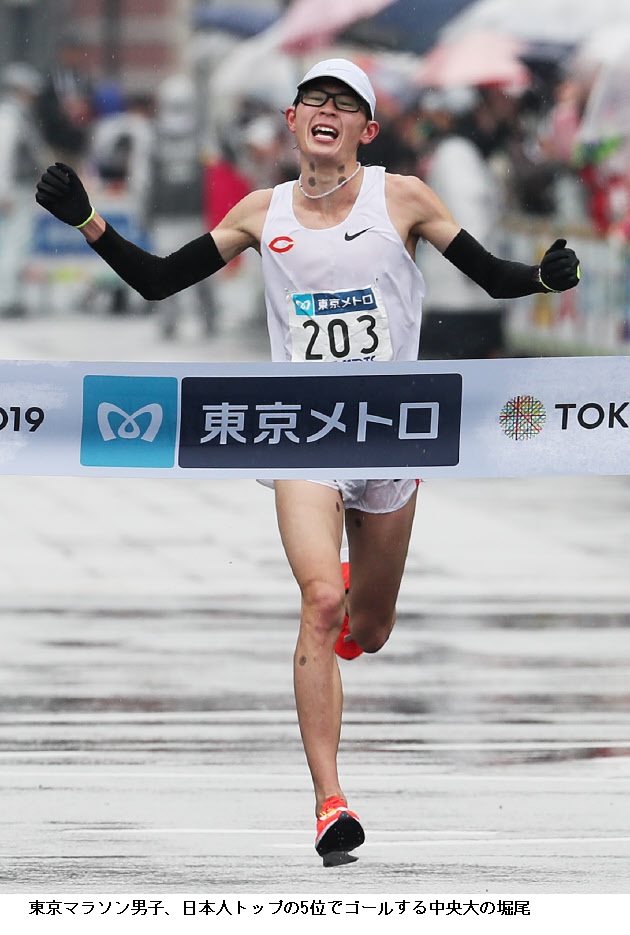 中大の堀尾、MGC切符に驚き 東京マラソン5位 ―― スタート前から冷たい雨が降る悪条件。寒さに耐えかねて棄権した大迫やオーバーペースもたたって30キロから急激に失速した実力者の姿に、その過酷さが表れていた。一方、飛ばしすぎの先頭集団に付き合わなかった後続の日本勢は、中盤まで淡々とレースを進める。初マラソンの堀尾はその中に紛れていた。