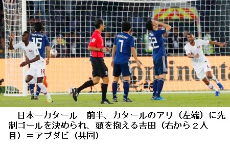 国際サッカー連盟(FIFA)ランキング50位の日本は同93位のカタールに前半、2点を先行された。後半に南野(ザルツブルク)のゴールで1点を返したが、PKで追加点を許した。16強入りした昨年のW杯ロシア大会後に就任した森保監督は12戦目で初黒星を喫した。 (東京新聞 2019年2月2日 01時12分)