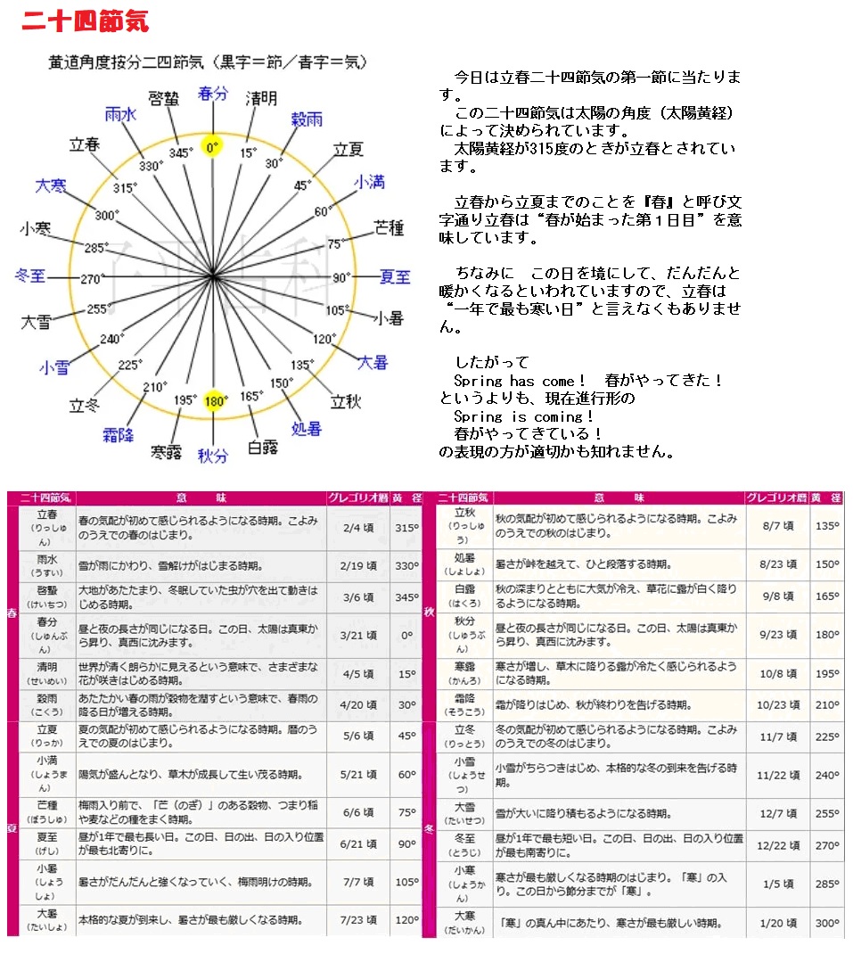 立春は太陽黄経が315度となる日てす。したがって、天体の運行に基づいているので、日付は年によって異なり、また未来の日付は軌道計算に基づく予測しかできないようです。