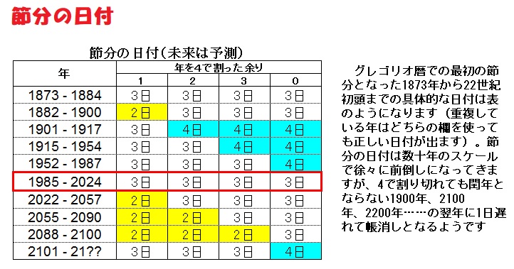 昨日は節分、グレゴリオ暦での最初の節分となった1873年から22世紀初頭までの具体的な日付は表のようになります(重複している年はどちらの欄を使っても正しい日付が出ます)。節分の日付は数十年のスケールで徐々に前倒しになってきますが、4で割り切れても閏年とならない1900年、2100年、2200年……の翌年に1日遅れて帳消しとなるようです。