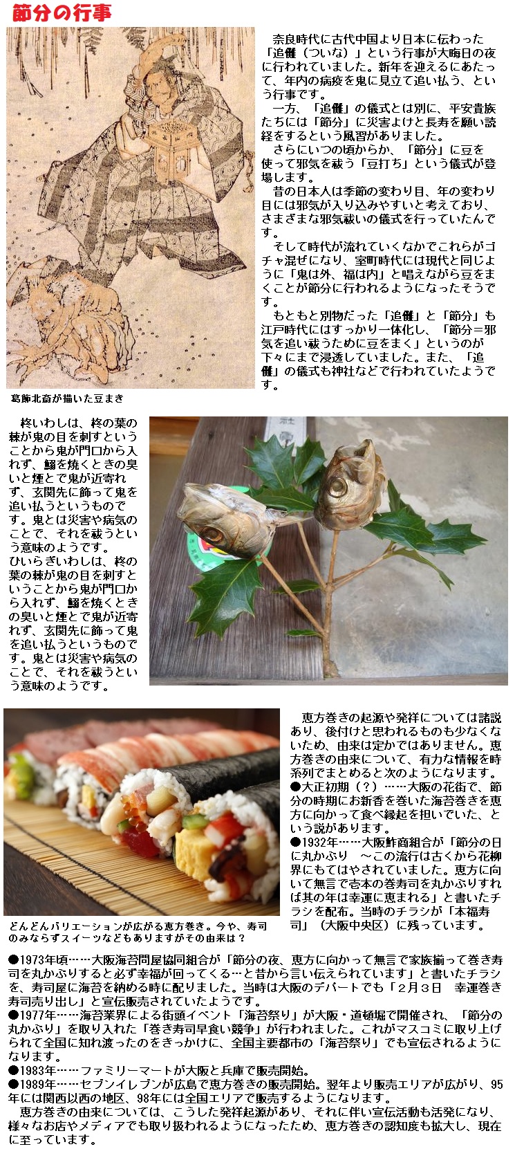 鰯(いわし)の頭を、柊(ひいらぎ)の小枝に刺して戸口に挿す風習いわゆる「柊いわし」は、近世以降行われるようになったものです。西日本では、節分に鰯を食べる習慣があるようです。