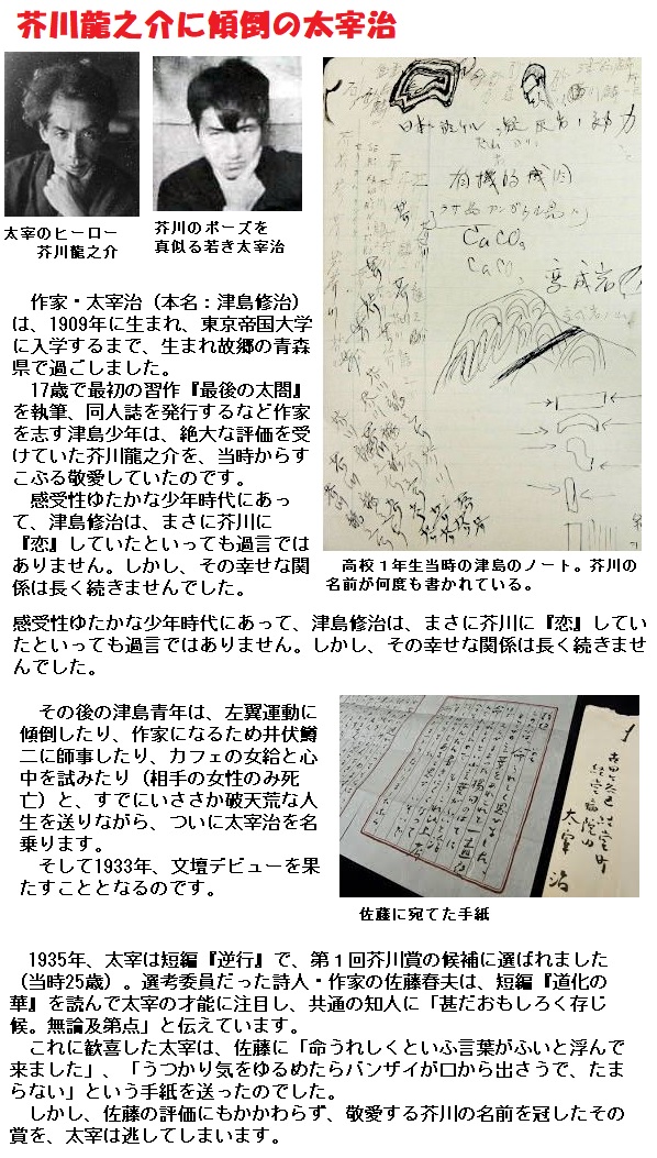■昭和2年に芥川龍之介が青酸カリを服毒して自殺した時、太宰は弘前高等学校の1年生で、いわゆる芥川の辞世の句「水洟や鼻の先だけ暮れのこる」を、ノートのあちこちに書き連ねています。太宰は芥川に心酔し、芥川を芸術至上主義の理想としていたのです。当時の太宰には、顎の下に手を添えた芥川と同じポーズをとった写真が多数見られますし、芥川になぞらえて、“芹川麟一郎”や“小川麟一郎”の筆名も考えていたようです。
