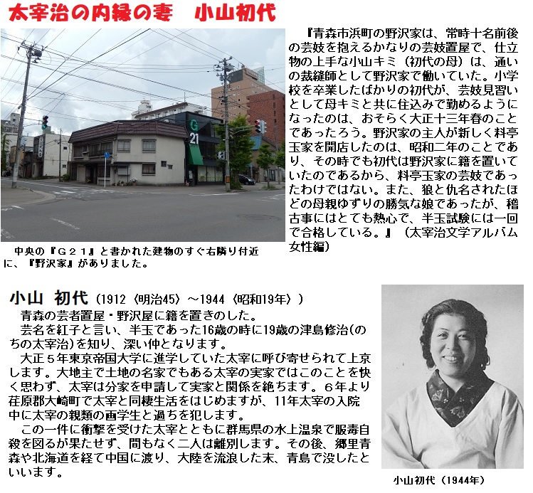 ■太宰は、やがて学業を放棄して、義太夫を習い、花柳界に出入りし、青森の料亭で15歳の芸妓紅子・小山(おやま)初代と知り合います。