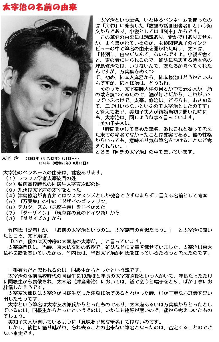 ■ちなみに、“太宰治”の筆名の由来には、「高校の同級生太宰友次郎説」「ダダイズム説」「ダァ・ザイン(da sein =そこに存在すること)説」「堕罪説」など諸説がありますが、「友人と考えた」としか本人は語っていません。
