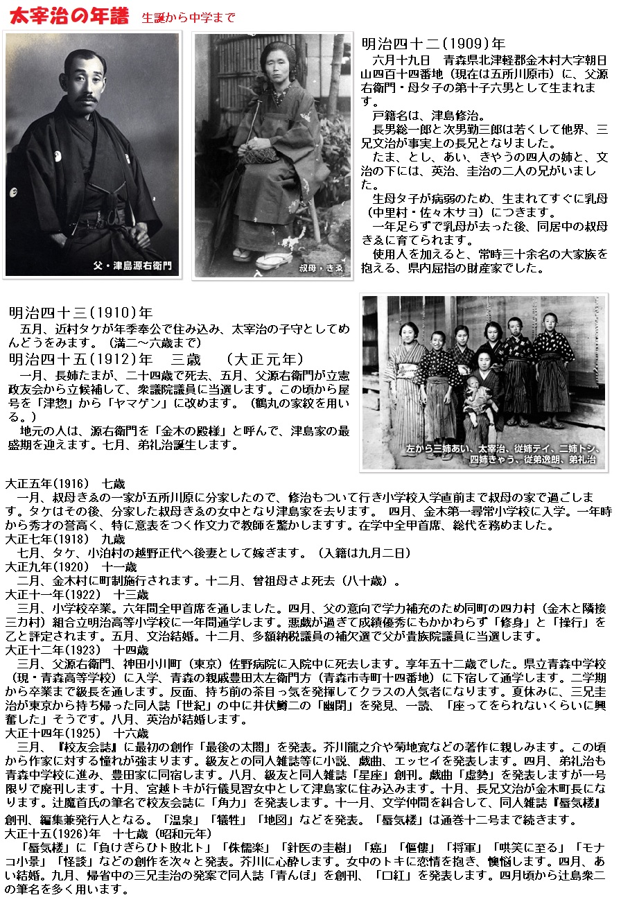 ■明治42年6月19日、津軽の大地主で、のちに貴族院議員となる父津島源右衛門、母タ子(たね)の第10子・六男として、太宰は青森県北津軽郡金木村に生まれました。長兄総一郎・次兄勤三郎の二人が夭折し、弟も早く亡くなり、芥川の境遇に似て、叔母のキヱ(きゑ)を実母のごとくにして育てられ、早熟で異常に感受性の強い子供でした。16歳のころから、同人雑誌に小説やエッセイを書きはじめています。太宰が14歳の時、父の源右衛門が病没し、三男の文治が家督を継ぎます。