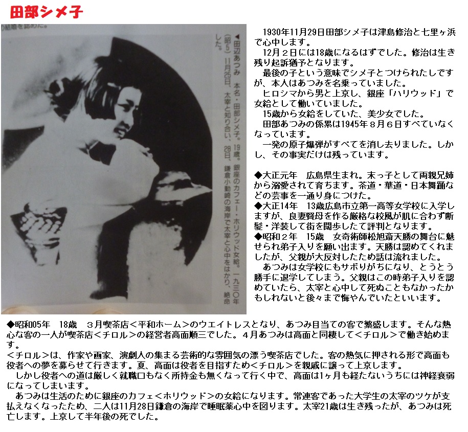 ■昭和4年12月、カルモチンを服用して、太宰は最初の自殺未遂を起こします。自分の出身階級に悩んでのことといわれていますが、太宰自身は、“微笑するだけ”で答えていません。翌年の4月、21歳で東京大学フランス文学科に入学、かねてから尊敬していた「山椒魚」の作者井伏鱒二に弟子入りします。青森から初代を呼び寄せ、同棲。11月24日に兄文治が小山家と結納を交わしますが、翌日、銀座のカフェの女給田部あつみ(シメ子・19歳)と出会い、3日間を共に過ごした後、神奈川県の小動崎(こゆるがさき)の岩の上で心中を図ります。シメ子は死亡、太宰は一命を取り留め、翌12月、青森で初代と仮祝言をあげます。