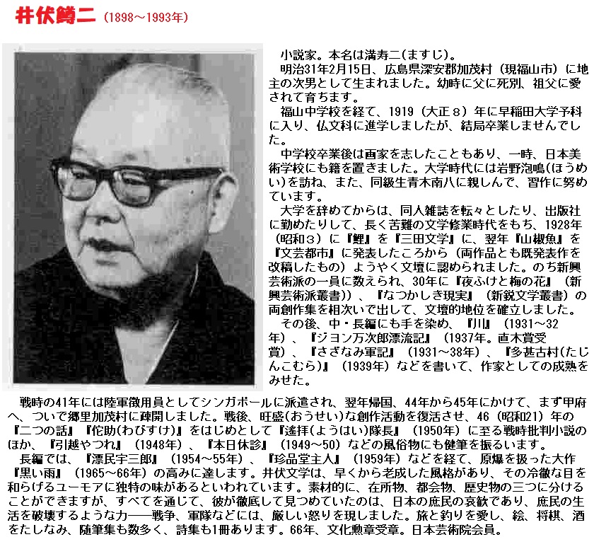 ■しかし、太宰のその難解な方法は理解されず、昭和11年10月、“結核療養”とだまされて精神病棟に入院させられるなど半狂人扱いされ、また入院中に初代と上京していた親戚の画学生小館善四郎の過ちを知ってショックを受け、昭和12年3月、初代とカルモチン自殺未遂をおこし、結局初代と離別します。そのようなどん底の状況の下で、昭和13年9月13日、井伏鱒二は、1年近く下宿生活をしながら筆を断っていた太宰を、山梨県御坂峠の天下茶屋に呼び寄せ、精神の安定と生活の再生を図ろうとしたのです。