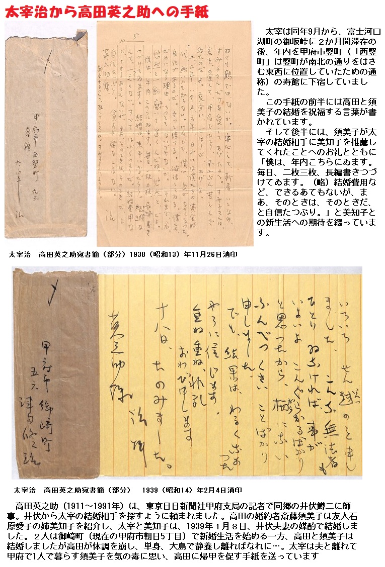 ■太宰は、この年の1月8日に井伏鱒二夫妻の媒酌で結婚をし、9月に甲府から三鷹に転居したところでした。妻となった石原美知子を紹介したのが、高田英之助です。彼は、井伏の郷里・広島県福山の後輩で、慶應大学の国文科を出て、東京日日新聞(現・毎日新聞)甲府支局に勤務していました。若きころ、太宰、伊馬春部とともに作家を目指す“井伏門下の三羽ガラス”といわれた人です。井伏から「太宰の妻に誰かよい人はいないだろうか」と高田に話があり、フィアンセの須美子の女学校時代の後輩・美知子はどうか、ということになったのです。実は、その直前にも、太宰には縁談話がありましたが、太宰の風評がよろしくなく、先方から断られていたのでした。