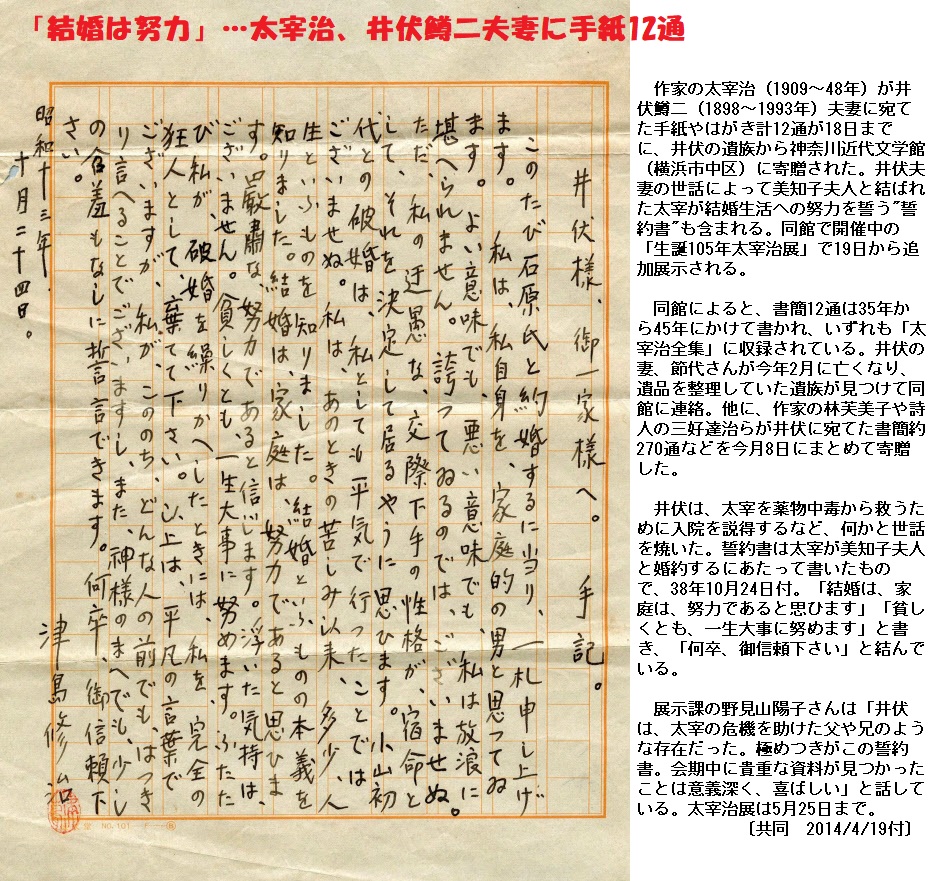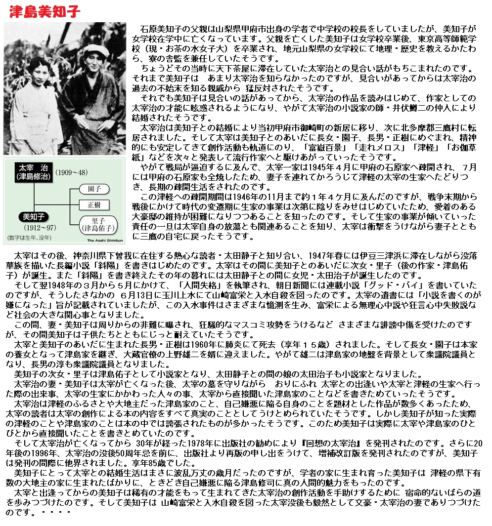■昭和13年のこの太宰と美知子の縁談は、小説「富嶽百景」にあるとおりです。「このうへは、縁談ことわられても仕方がない、と覚悟を決め、とにかく先方へ、事の次第を洗ひざらひ言つて見よう」と破れかぶれの太宰に対し、太宰の過去に目を瞑り、「ことごとしい式などは、かへつて当惑するやうなもので、ただ、あなたおひとり、愛情と、職業に対する誠意さへ、お持ちならば、それで私たち、結構でございます。」と美知子の母親。「この母に、孝行しようと思つた」太宰は、井伏に“生活の立て直し”を誓約します。