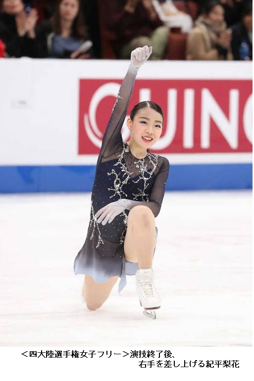 紀平がまた衝撃的な勝ち方をした。故障を抱えながら、完璧な演技で逆転V。プログラム「ビューティフル・ストーム」のフィニッシュの後、氷に膝をついたまま両手でガッツポーズ、そして、右拳を突き上げた。