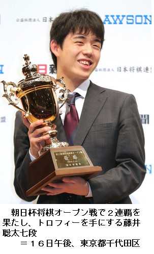 東京都千代田区で行われた第12回朝日杯将棋オープン戦の準決勝と決勝。藤井七段は準決勝で、名人戦の挑戦者になった経験もある行方(なめかた)尚史八段(45)に勝利。決勝では、公式戦初対戦となる渡辺明棋王(34)と激突した。