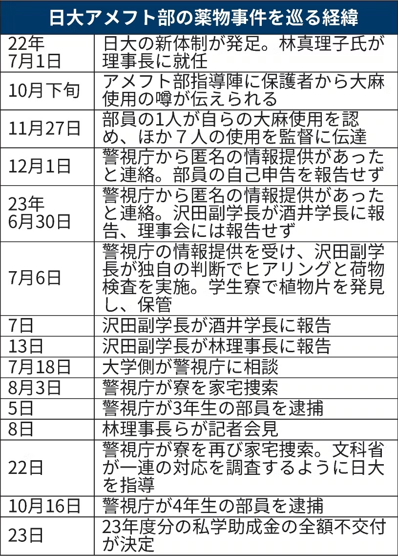 報告書によると、2022年11月に部員の1人が監督に大麻使用を申告し、ほかに7人の部員も使っていることを説明したが、アメフト部部長や運動部を統括する競技スポーツ部長は担当の沢田副学長に報告しなかった。