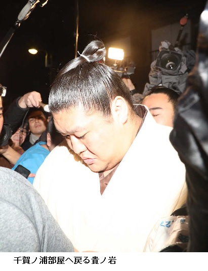 暫定処置として、貴ノ岩は巡業を途中休場し、部屋で謹慎。6日の午後5時半、都内の自宅にいた貴ノ岩は迎えに来た師匠の千賀ノ浦親方(元小結・隆三杉)の車に乗り込み、千賀ノ浦部屋に向かった。部屋前には約50人の報道陣が待機。車を降りると無数のフラッシュを浴び、硬い表情のまま無言で部屋の奥へと消えた。一方で、千賀ノ浦親方は報道陣の「反省の色はあったか」という問いかけに、「後悔です、後悔」と弟子の胸中を代弁した。