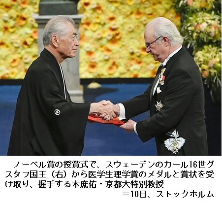 会場で本庶さんの晴れ姿を見守った妻の滋子さん(76)は「大変荘厳な式で光栄に思っている」と喜んだ。かつての教え子の石田靖雅奈良先端科学技術大学院大准教授(57)は「本庶先生が受賞された後の拍手は他の人の2倍ぐらい大きかった。がんの治療ということで関心がすごく強いと思う」と話した。