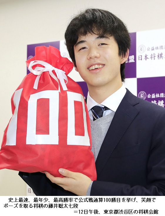 藤井聡太七段が最速100勝 最年少で最高勝率 ―― 将棋の藤井聡太七段(16)は12日、東京都渋谷区の将棋会館で指された第27期銀河戦(囲碁・将棋チャンネル主催)で阿部健治郎七段(29)を破り、史上最速、最年少、最高勝率で公式戦通算100勝目(18敗)を挙げた。
