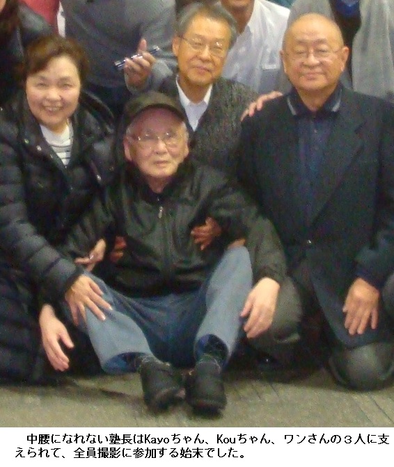 いやはや、塾長も足・腰が弱って中腰になることができず、3人の塾友に支えてもらいながらの撮影でした。