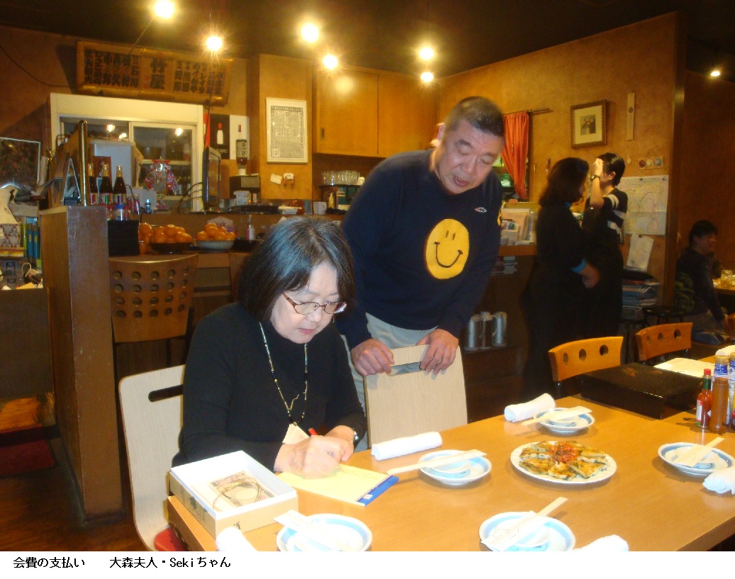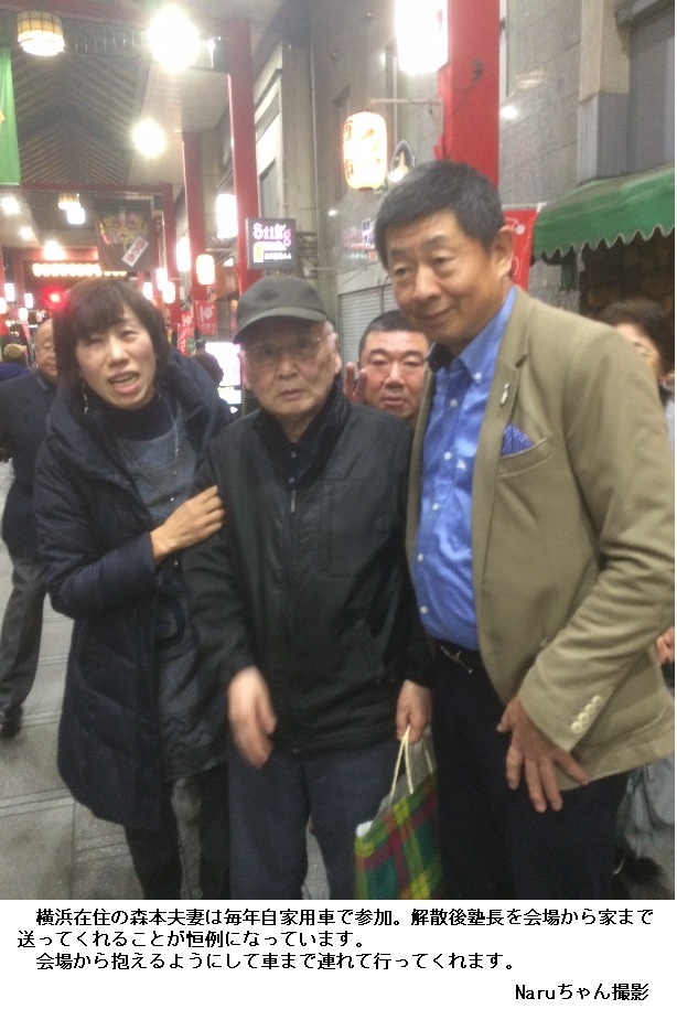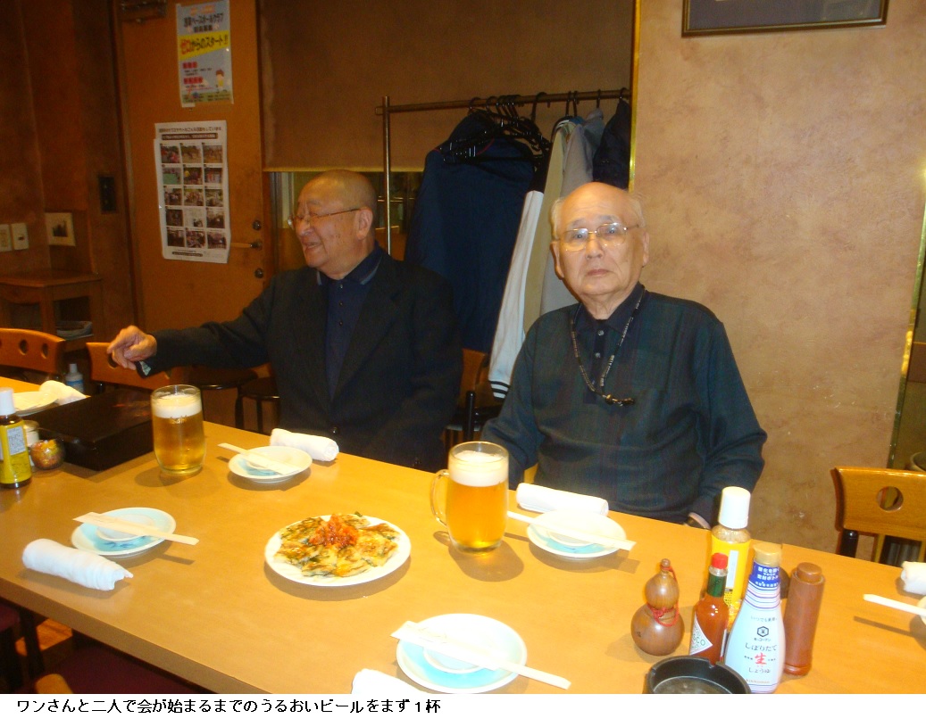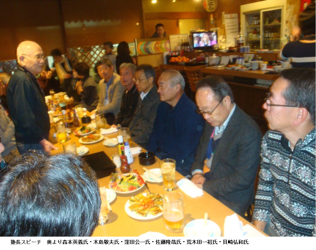 ひさご通りの入り口で車から降りると会場のTAKEYAまではすぐです。ジャンバーを脱ぐのにTAKEYAの奥さんが傍に来て手伝ってくれます。若手の塾友が数名来ているだけでしたが、間もなく大森夫妻も到着します。会費を払って大森師と並んで席に着くと会が始まる前の潤いの生ビールで乾杯です。