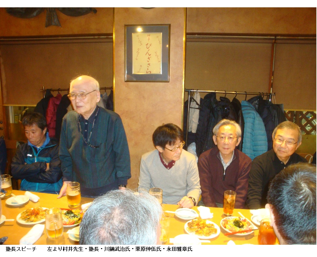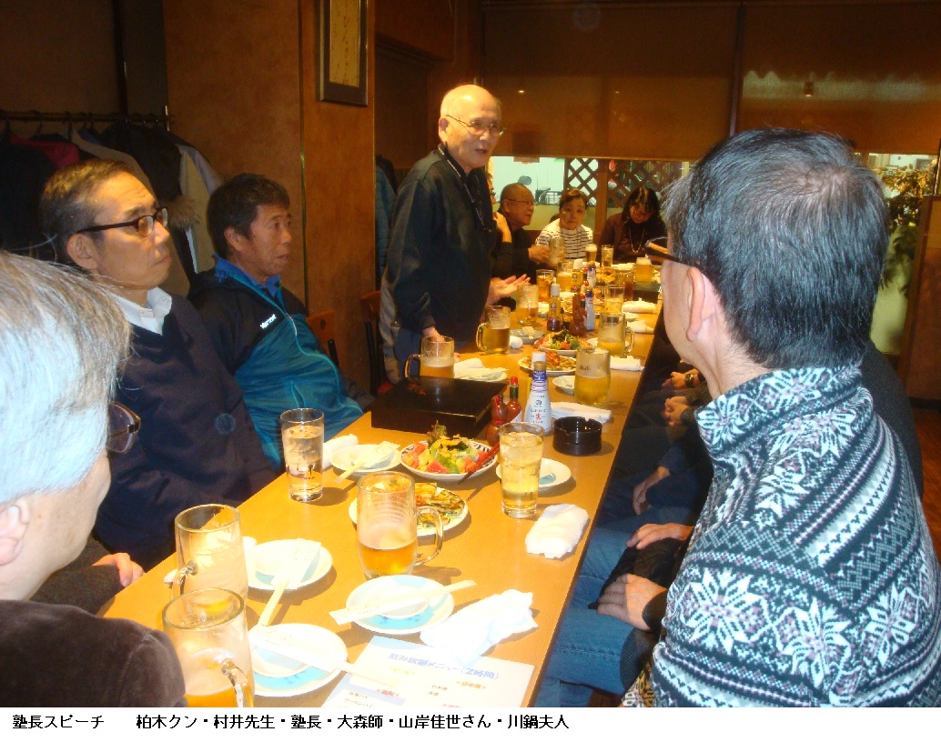 間もなくNabeちゃんが到着して、彼の司会で会が始まります。例年のことですが、塾長のスピーチから会が進みます。かつては結婚式の仲人スピーチで長すぎると顰蹙を買った塾長も今は年を取って思うように言葉が出ません。自分で何を話したかよく覚えていません。それでも、みんなは静かに聞いていてくれたようです。