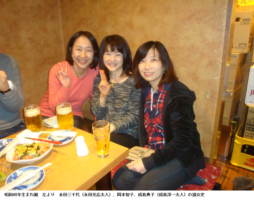 カラー写真の2枚目は永田光広夫人の三千代さん(旧姓、瀬古 愛称はミッチー)・岡本智子さん(旧姓は小櫃 愛称はオビッちゃん)・成島典子さん(Naruちゃんの夫人)で、昭和40年生まれ組です。