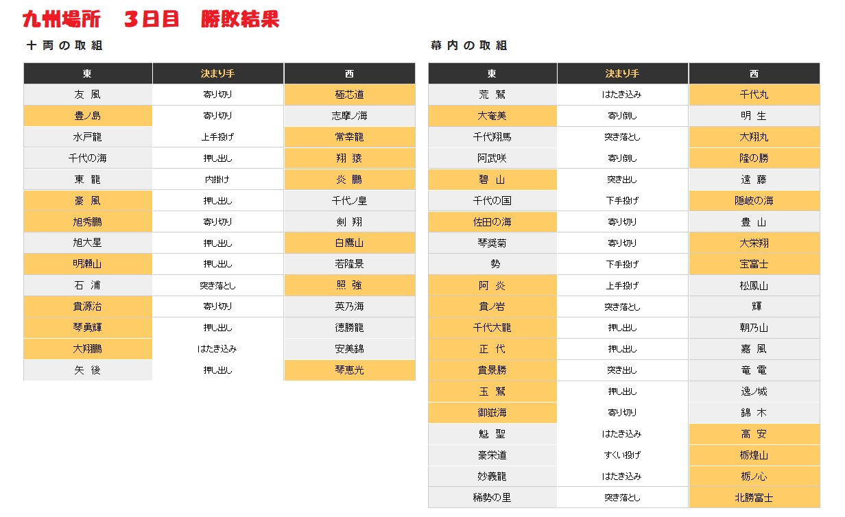 西前頭6枚目の輝(七尾市出身、高田川部屋、金沢市西南部中OB)は敗れて2勝4敗となり、西前頭12枚目の遠藤(穴水町出身、追手風部屋、金沢学院高OB)も黒星が付き、3勝3敗となった。