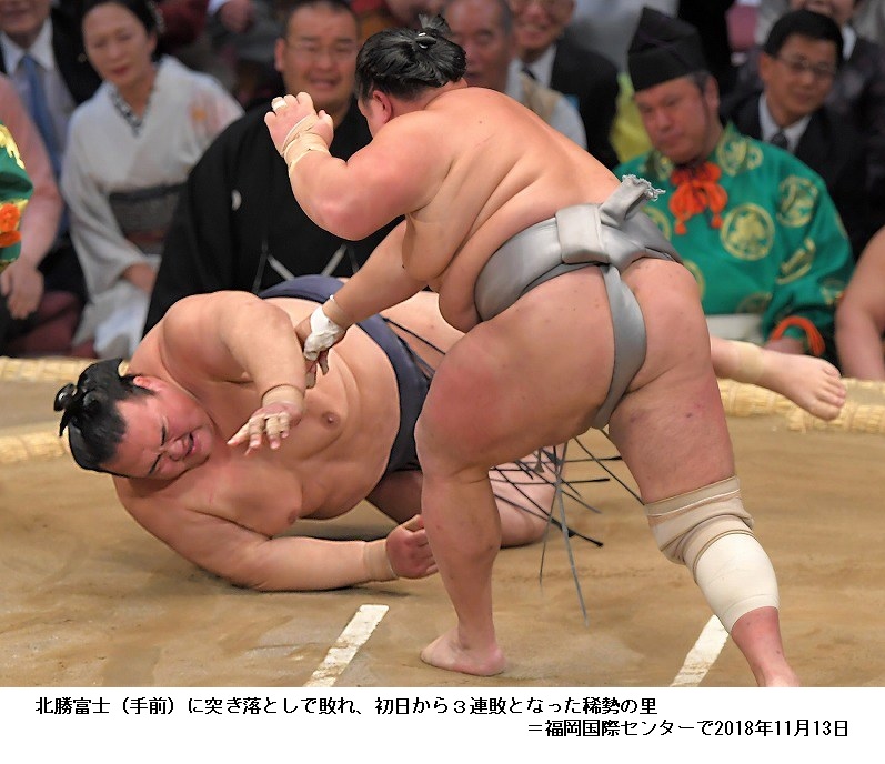 西前頭10枚目の豊山(新潟市出身、時津風部屋、金沢学院高OB)は東前頭8枚目の勢(伊勢ノ海部屋)に押し出しで敗れて1勝5敗。西前頭14枚目の大翔丸(大阪市出身、追手風部屋、金沢学院高OB)は東前頭16枚目の荒鷲(峰崎部屋)のはたき込みに屈し、3勝3敗となった。 (北国新聞 2018/11/17 01:52)