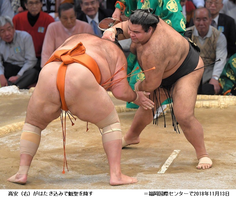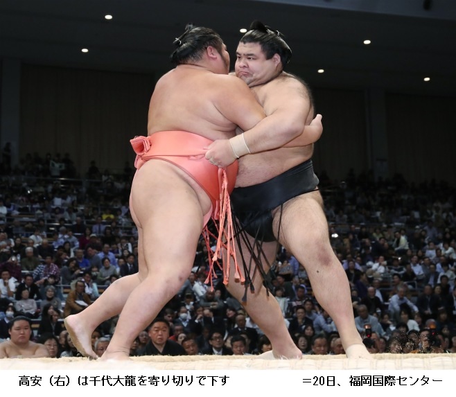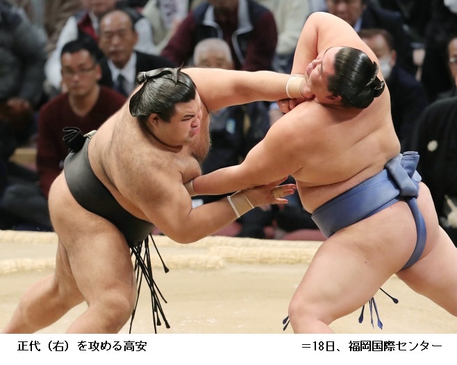 高安は平幕正代を押し出し、連敗を免れて6勝目を挙げた。