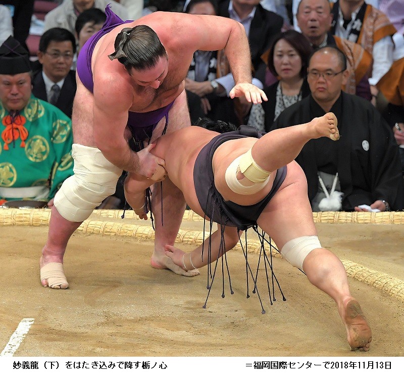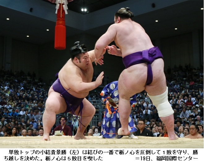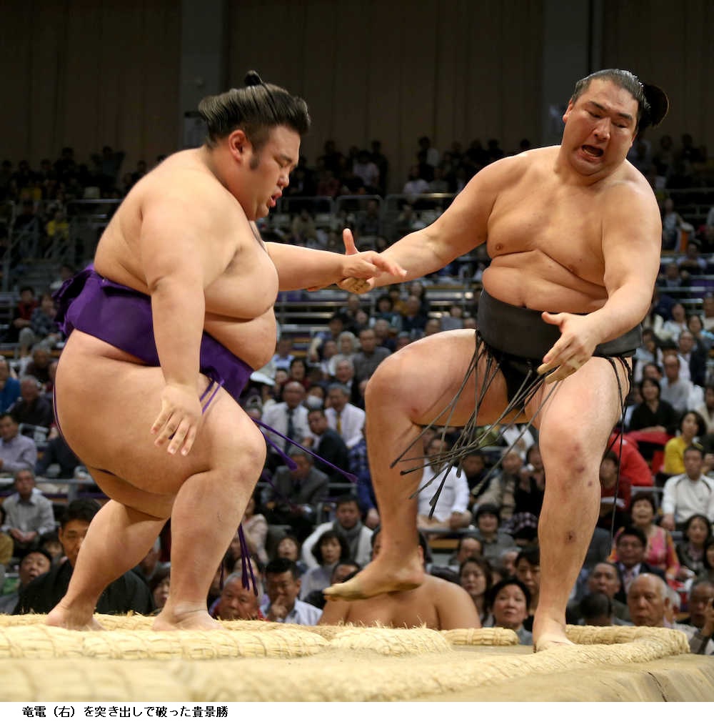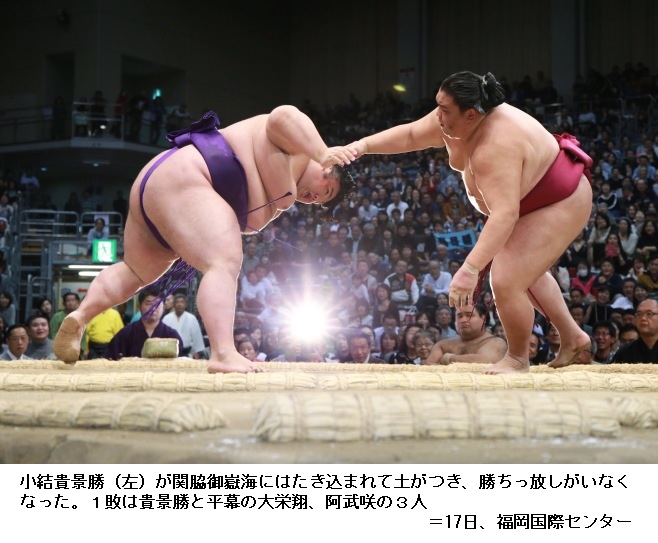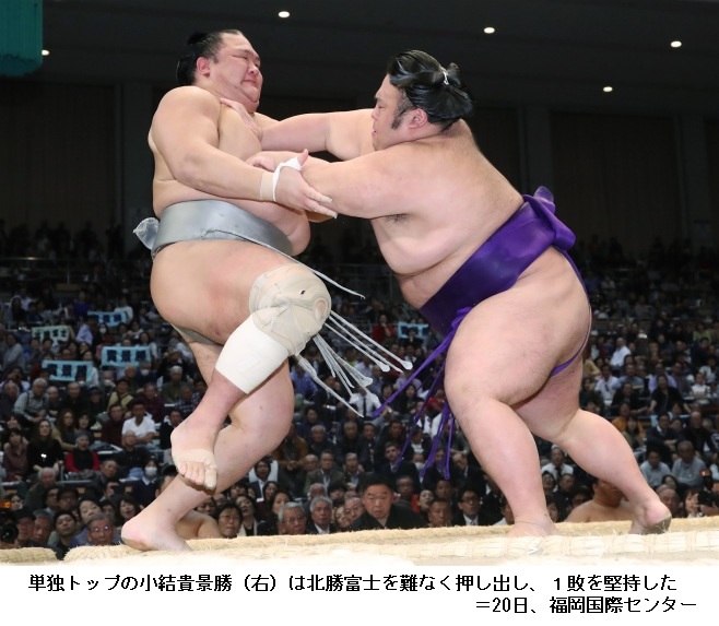 小結貴景勝が妙義龍を引き落とし、ただ一人1敗を守って単独首位に立った。