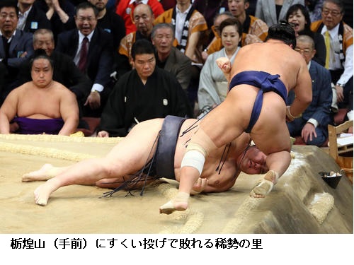 稀勢の里が屈辱4連敗 高安、貴景勝、栃煌山4連勝 ―― 一人横綱で臨んでいる稀勢の里(32=田子ノ浦)が悪夢の4連敗を喫した。前頭2枚目栃煌山(31=春日野)に対し、軍配は1度、稀勢の里に上がったが、物言いの末、軍配差し違えで敗れた。