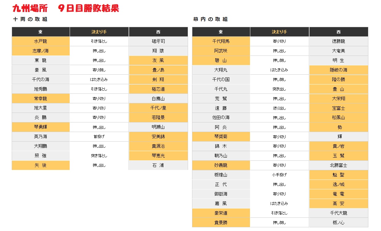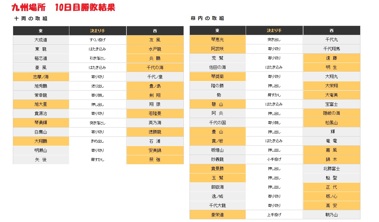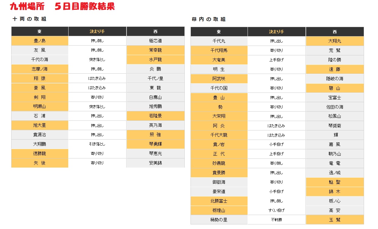 関脇は御嶽海が竜電に寄り切られて5勝4敗。逸ノ城は正代を押し出して3勝6敗とした。
